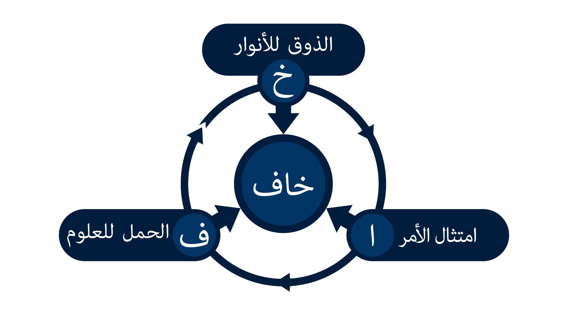 ج- الخوف: في اللغة هو الذعر والفزع مع تصور مكروه ينتج عن علامة بينة، وهي من فعل خاف يخاف خوفا قال ربنا: "وَٱلَّذِينَ يَصِلُونَ مَا أَمَرَ ٱللَّهُ بِهِۦٓ أَن يُوصَلَ وَيَخشَونَ رَبَّهُم وَيَخَافُونَ سُوءَ ٱلحِسَابِ" فالخوف يكون على العاقبة، فمن توفرت فيه أنوار الكلمة أدخلته في حرز المؤمنين وعصمته من الخوف من غير الله قال ربنا: "إِنَّمَا ذَٰلِكُمُ ٱلشَّيطَٰنُ يُخَوِّفُ أَولِيَاءَهُۥ فَلَا تَخَافُوهُم وَخَافُونِ إِن كُنتُم مُّؤمِنِينَ" والخوف من الله يعصم صاحبه من تبعات الخوف قال ربنا: " وَمَن يَعمَل مِنَ ٱلصَّٰلِحَٰتِ وَهُوَ مُؤمِن فَلَا يَخَافُ ظُلما وَلَا هَضما " فتأمل أنوار "خاف" من قوله تعالى: "وَأَمَّا مَن خَافَ مَقَامَ رَبِّهِۦ وَنَهَى ٱلنَّفسَ عَنِ ٱلهَوَىٰ فَإِنَّ ٱلجَنَّةَ هِيَ ٱلمَأوَىٰ " وهذه الصور بأنوار حروف الكلمات كما يلي: